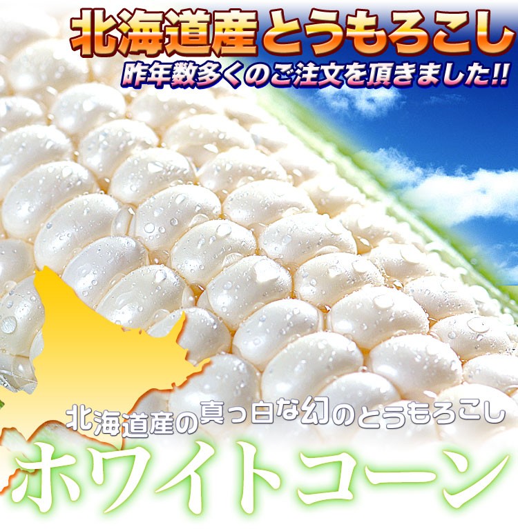≪クーポン発行中≫2個ご注文で1,000円OFF(1個あたり500円OFF)クーポン有効期間は発行から10~15日です。クーポン有効期間中は1ユーザー2回(2枚)のみご利用可能です。クーポン適応は一度のご注文に2個ご注文の場合に適応されます。―――――――――――――――――――――――――――▼早いがトクトク▼【超早期割引★2,280円】2018年1月26日(金)~6月7日(木)AM9:59まで【早期割引★2,380円】2018年6月7日(木)AM10:00~8月10日(金)AM9:59まで【通常★2,480円】2018年8月10日(金)AM10:00~ホワイトコーン(皮つき)■原産地:北海道産■内容量:10本(L~2Lサイズ/約4kg前後)※重量は目安となります。■賞味目安:到着後は、皮を剥いて茹でてから冷蔵庫で保存し、なるべく早めにお召し上がり下さい。■商品について:2017年度より「白いとうもろこし」の商品名はホワイトコーンとなりました。数ある白系品種の中から選りすぐったものをお届けいたします(品種指定はできません)■発送形態:冷蔵発送■【同梱不可】※同『ホワイトコーン』商品同士のみ同梱OK■発送予定:8月下旬前後頃から順次■お届け日指定不可