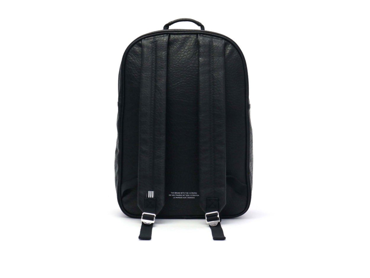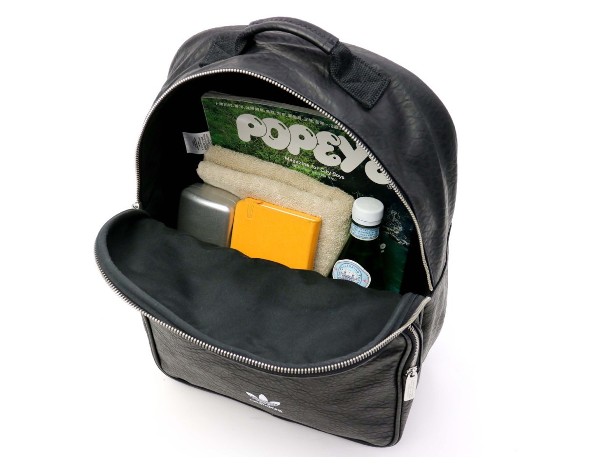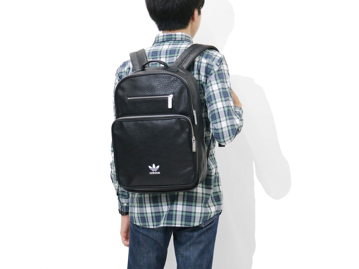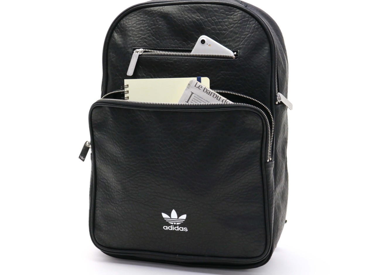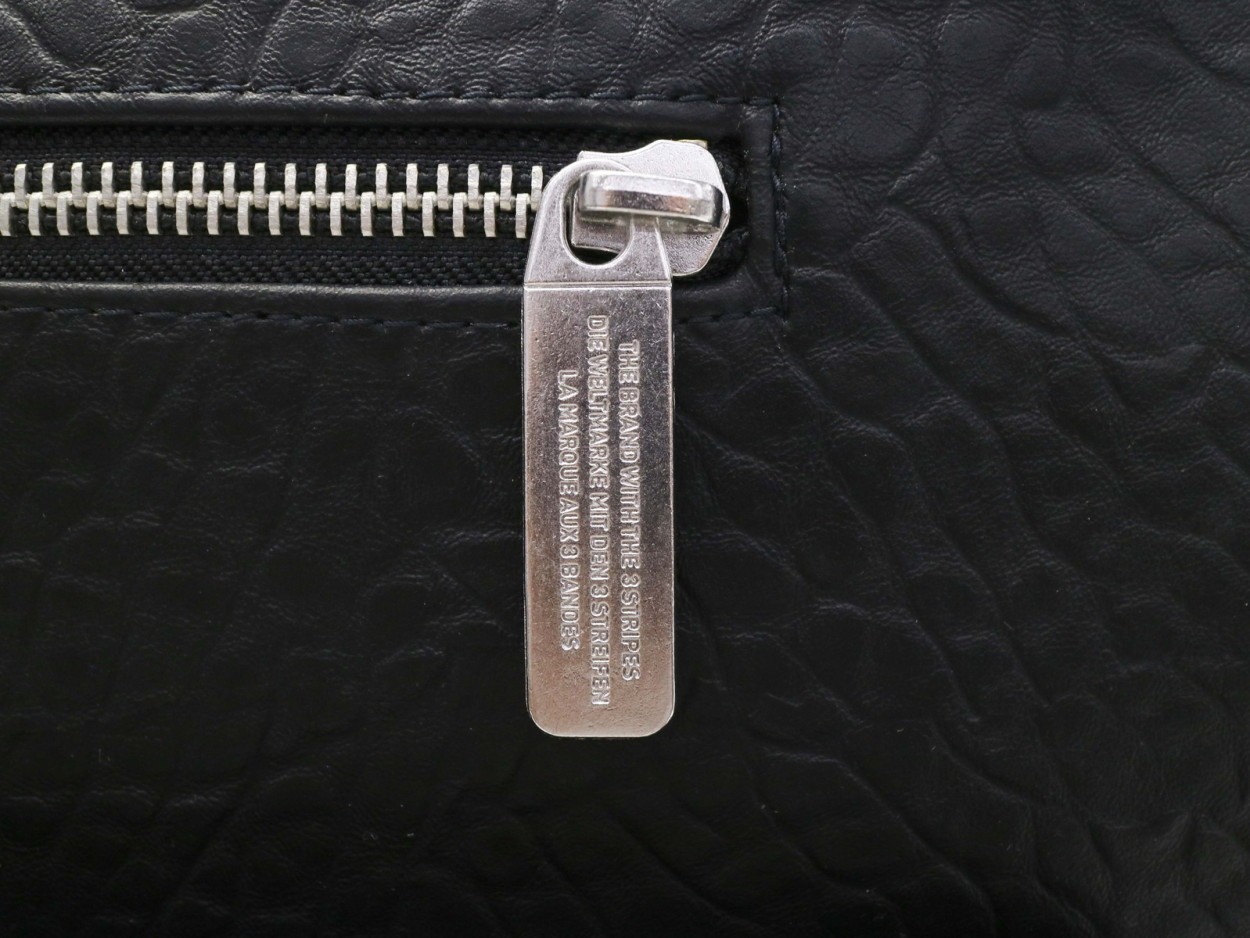 レザーの質感豊かな黒のフェイクレザーにあしらった、メタルのディテールとトレフォイルのadidasロゴがアクセント。カジュアルながらも大人らしく使えるクラシックなデザインです。