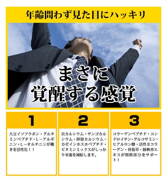 | 原材料名 | 小麦蛋白加水分解物(小麦由来)、カゼイン(乳由来)、フィッシュコラーゲンペプチド、サメ軟骨エキス、豚軟骨抽出物、筋骨草、大豆胚芽抽出物、オルニチン、豚軟骨エキス、セルロース、貝殻焼成カルシウム、卵殻焼成カルシウム(卵由来)、造礁サンゴ焼成カルシウム、ショ糖エステル、微粒酸化ケイ素、グルコサミン(エビ・カニ由来)、ヒアルロン酸、L-アルギニン、ビタミンC、ナイアシン、パントテン酸Ca、ビタミンE、ビタミンB2、ビタミンB1、ビタミンB6、葉酸、ビタミンA、ビタミン/TD> |