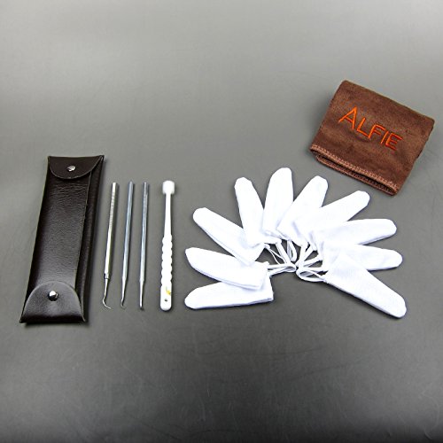This set comes with 3 piece tarter scraper and remover: 1 scraper, 2 scaler. Each measures 6" long, a 360-degree toothbrush is 6" long, 10 finger gloves measures 3.5"L x 1.5"W, a microfiber towel and a storage pouch