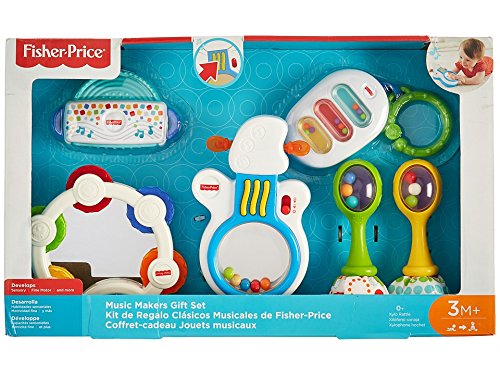 ReleaseDate : 2016-07-17 Studio : Fisher-Price Publisher : Fisher-Price Binding : Baby Product Product Description Teeny-tiny ones can shake, rattle and roll (and bat, clack and teethe) their way to sensory- and skill-building fun with the Fisher-Price Music Makers Gift Set. These 5 musical activity toys are just the right size for little hands to grasp so baby won't miss a beat. So go ahead, baby, make some noise whether you're at home or on the go-go-go! Rock 'n Roll Guitar has a roly-poly base to bat at for fun tunes and "strings" to press for rocking' music and guitar riffs! Shake 'n Beats Tambourine engages and entertains baby with its bright colors, click-clack sounds, shiny mirror, and roly-poly base. Harmonica Tether is super soft with a chewy mouthpiece and fun sounds when baby gives it a shake. Rattle 'n Rock Maracas feature soft pom-poms and colorful rattle beads in the handles for baby to shake, shake, shake! Xylo Rattle is easy for baby to grasp and shake, with fun rattle and squeak sounds and a link to take the music on the road! 0