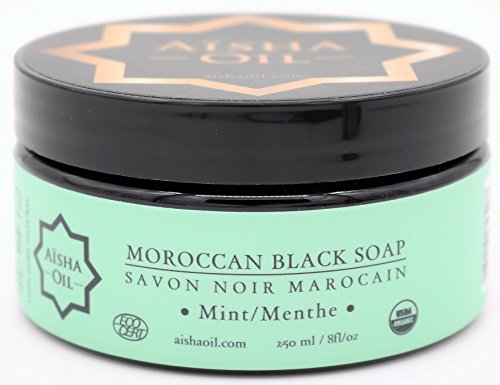 The Moroccan Black Soap (a.k.a. Savon Noir, or Savon Beldi), is one of our favourite parts of the Moroccan hammam ritual. It's a perfect mixture of olive oil and other essential oils (such as eucalyptus oil or wormwood), macerated black olives, which are soaked in salt and potash, and scented with argan, lavender, rose or orange blossom. It has been created with techniques that are more than 3000 years old, and used both to prepare the skin for exfoliation, and for exfoliation itself; it is an ultimate cleansing treatment for the skin. Aisha Oil Moroccan Black Soap products are 100% organically produced, starting by extracting and cold-pressing the kernels of the olives. This oil then goes through the same rigorous refining process as all of our other oils, where it is filtered to achieve optimum clarity. Once we've got the oil, the olives (which have been pitted and crushed) are added, and the mixture is soaked in a solution of salt and potash. Some companies use artificial potash, but ours is always 100% organic and unprocessed. Our traditionally-harvested potash has been made with the utmost attention to detail, making sure you only receive the most natural ingredients in your soap. How do I use it? Moroccan Black soap is extremely useful, beyond the common uses of regular soap. It doesn't feel like soap, though, and is much closer to the consistency of butter. Black Soap does not produce a large volume of lather, so it is important to always make sure your pores are open before applying the soap. This means ensuring that your skin is moistened with warm water, and that you use the soap in a steamy bathroom (or Hammam, or sauna). Pure Organic Moroccan Black Soap Mint - Aisha Oil - Exfoliating Scrub SoapFeature