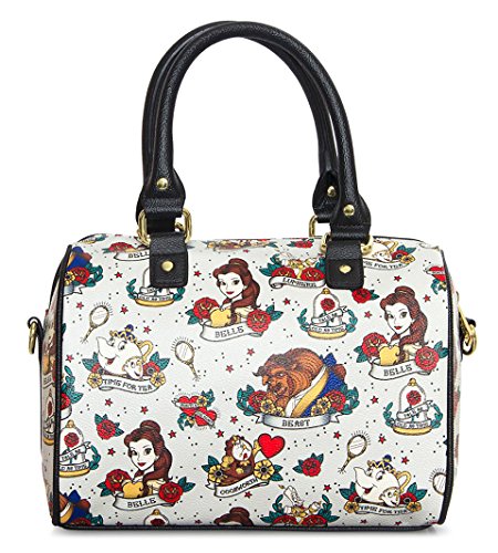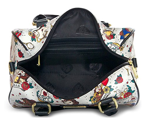This Loungefly handbag features Disney's Beauty and the Beast characters in an allover old school tattoo print. There are Belle and the Beast, plus Lumiere, Mrs. Potts, her son Chip, and Cogsworths. This is a boutique quality handbag with lots of great detailing. Inside contains one large zip pocket and an open slip pocket large enough for most larger phones. Fully lined with black on black Loungefly logo fabric. Measures 10 inches wide, 9 inches high, 7 inch depth. 5 inch handle drop. Adjustable and detachable crossbody long straps. Shiny gold hardware. Made of vegan faux leather.Feature