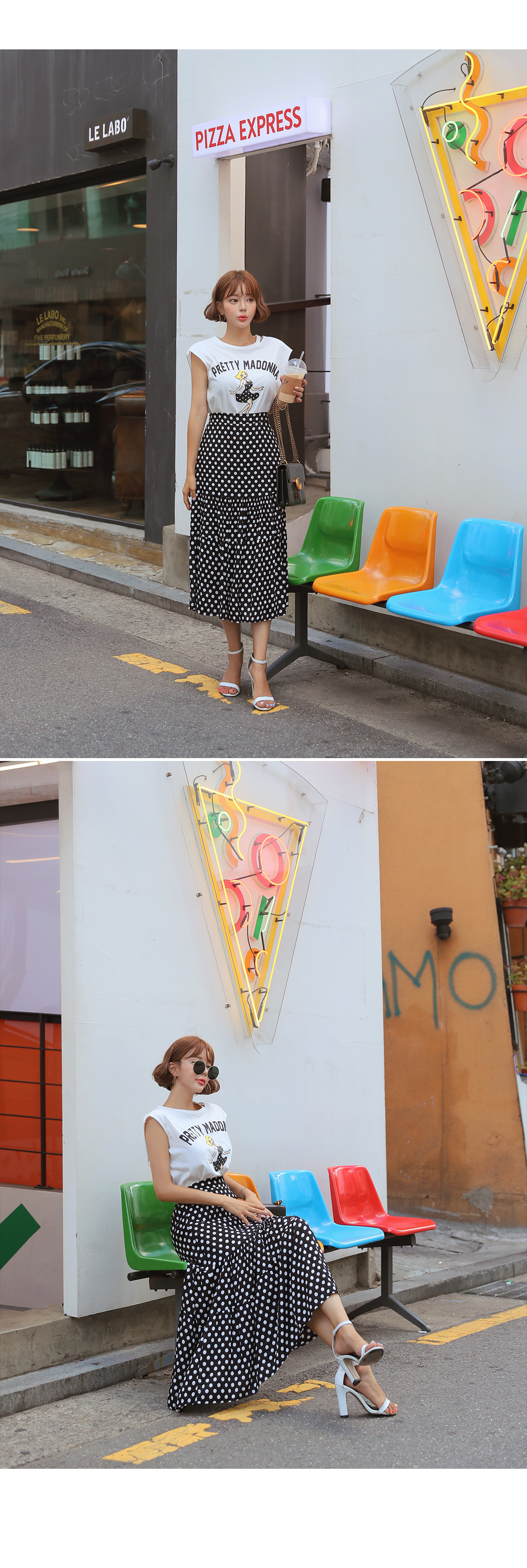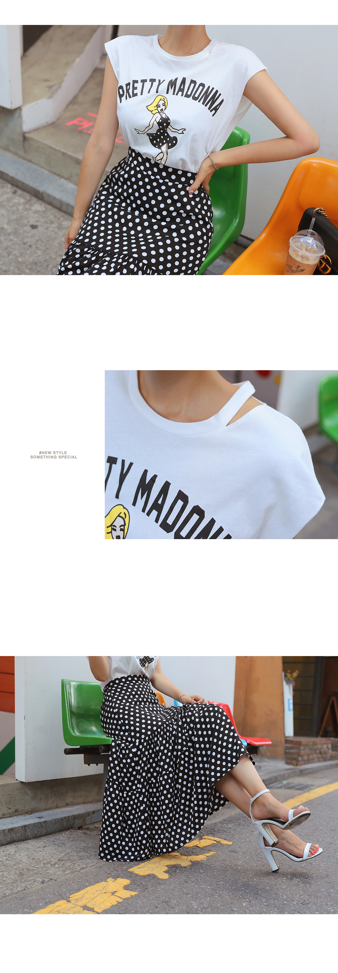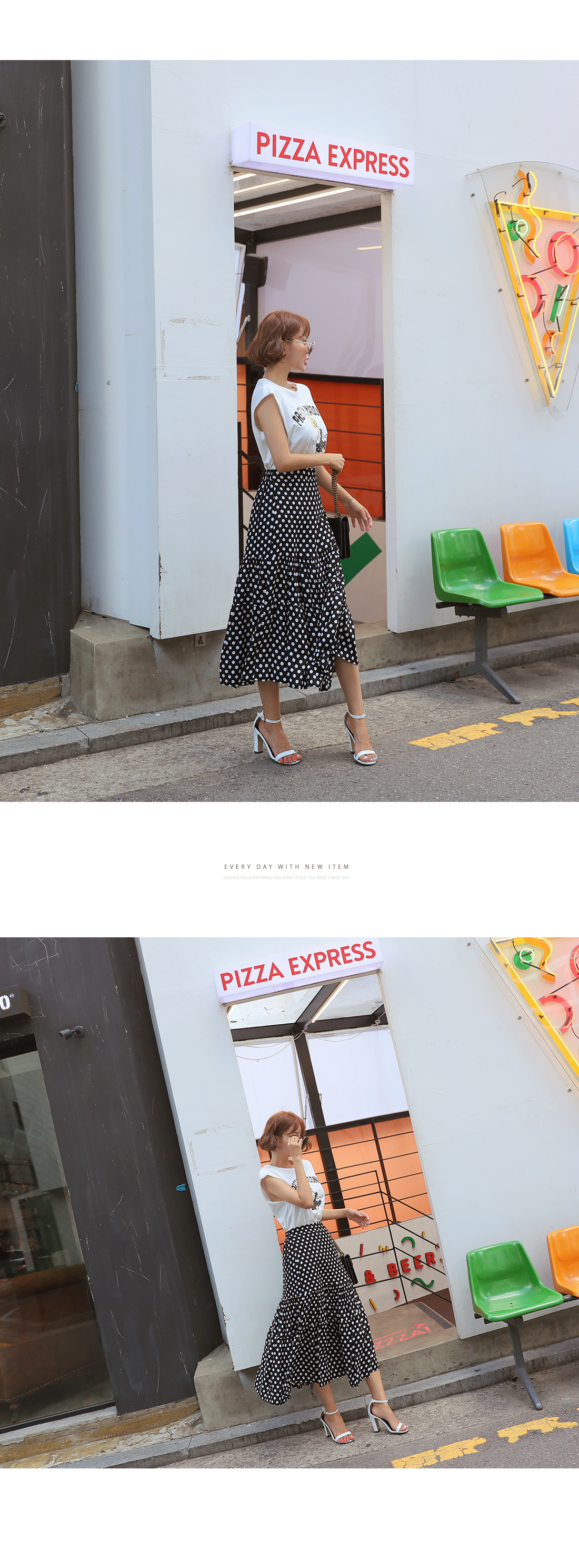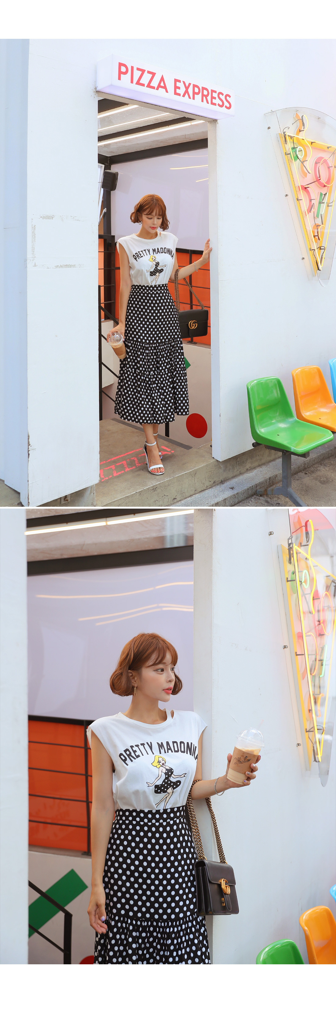 MD COMMENT포인트 룩을 완성시켜 줄 나염 티셔츠도트 롱스커트 SET아이템을 소개할게요.슬리브리스는 프론트에 유니크한 프린팅 디테일로멋스러운 포인트를 주었으며캐주얼한 무드도 가져갈 수 있는데요.여유있는 핏으로 부담없이 즐기기 좋으며 넥 라인에 트임을 주어 스타일리쉬한 포인트를 더해주었어요.암홀라인에 내추럴한 컷팅으로 마무리하여 룩에 빈티지한 무드도 느껴볼 수 있구요.스커트는 허리 높게 올라오는 하이웨스트 디자인에롱한 기장감이 더해져 다리라인을 길어보이게 연출해주구요.허리라인에 쫀쫀한 밴딩을 주어 안정감있는 착용이 가능해요.허벅지 중간 부분까지 오는 안감을 구성하여 비침걱정을 덜어주었으며별다른 오픈 클로징 없이 손쉬운 탈, 착용이 가능하답니다.슬리브리스와 스커트 모두 가벼운 폴리 소재감으로 S/S시즌 시원하게 즐기기 좋으며모델이 착용한 것처럼 set로는 물론- 각각 단독으로 다양한 아이템과 매치하여 활용도 높은 세트 아이템으로 추천해요!COLOR/SIZE블랙FREEMODEL FITTING블랙/FREE
