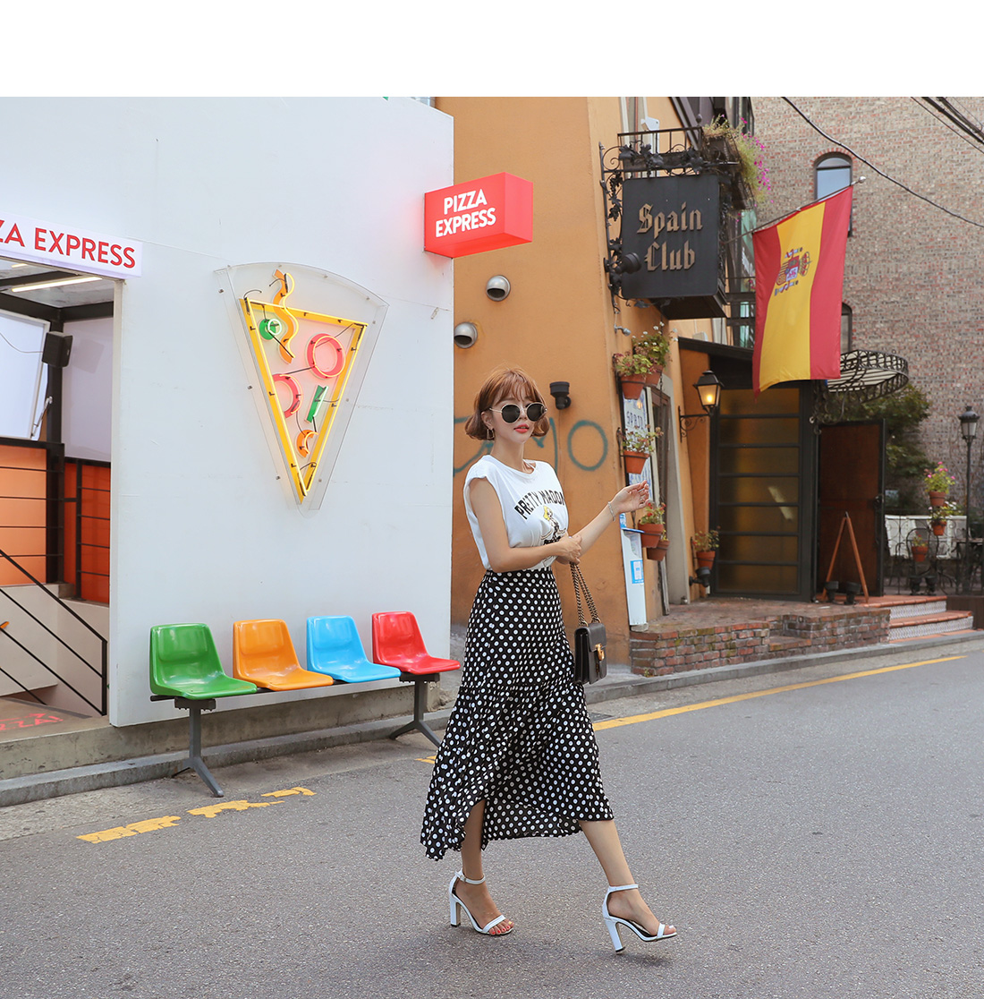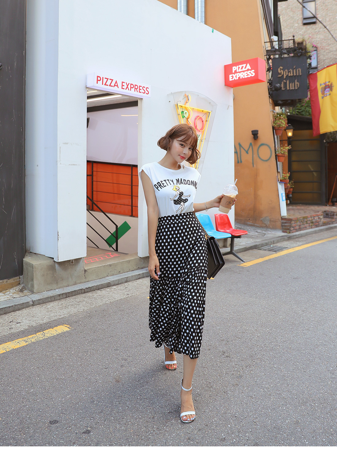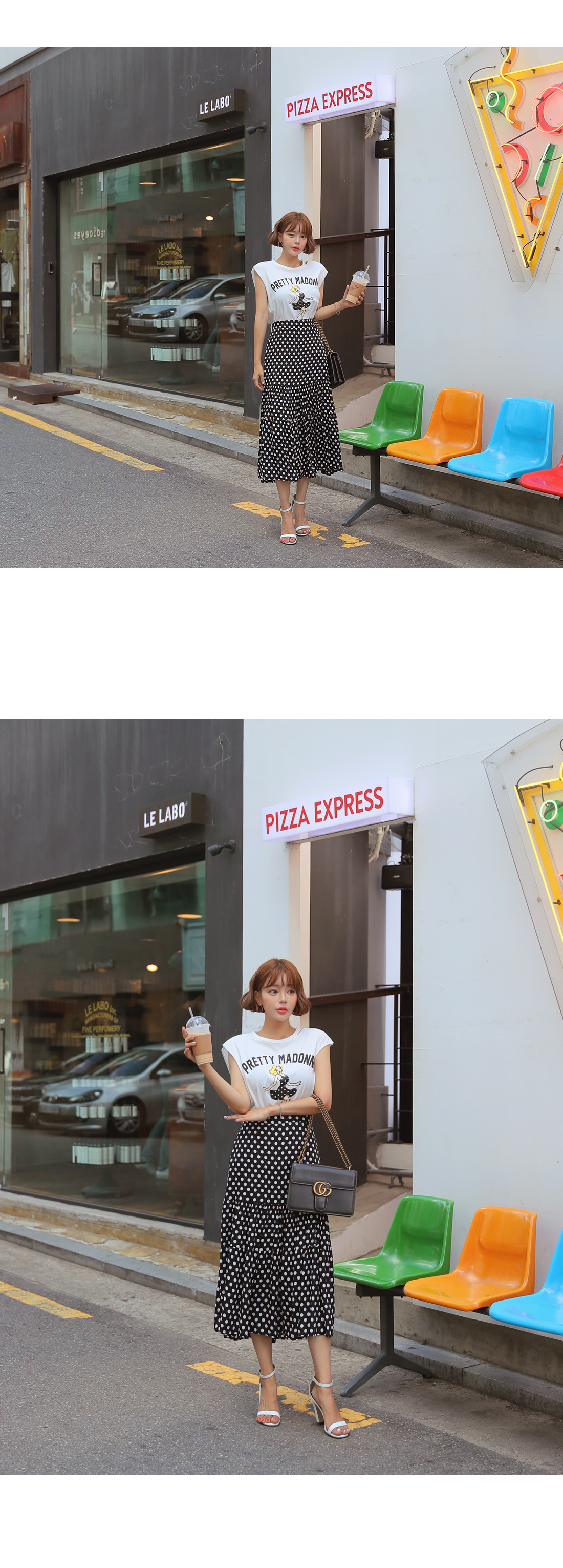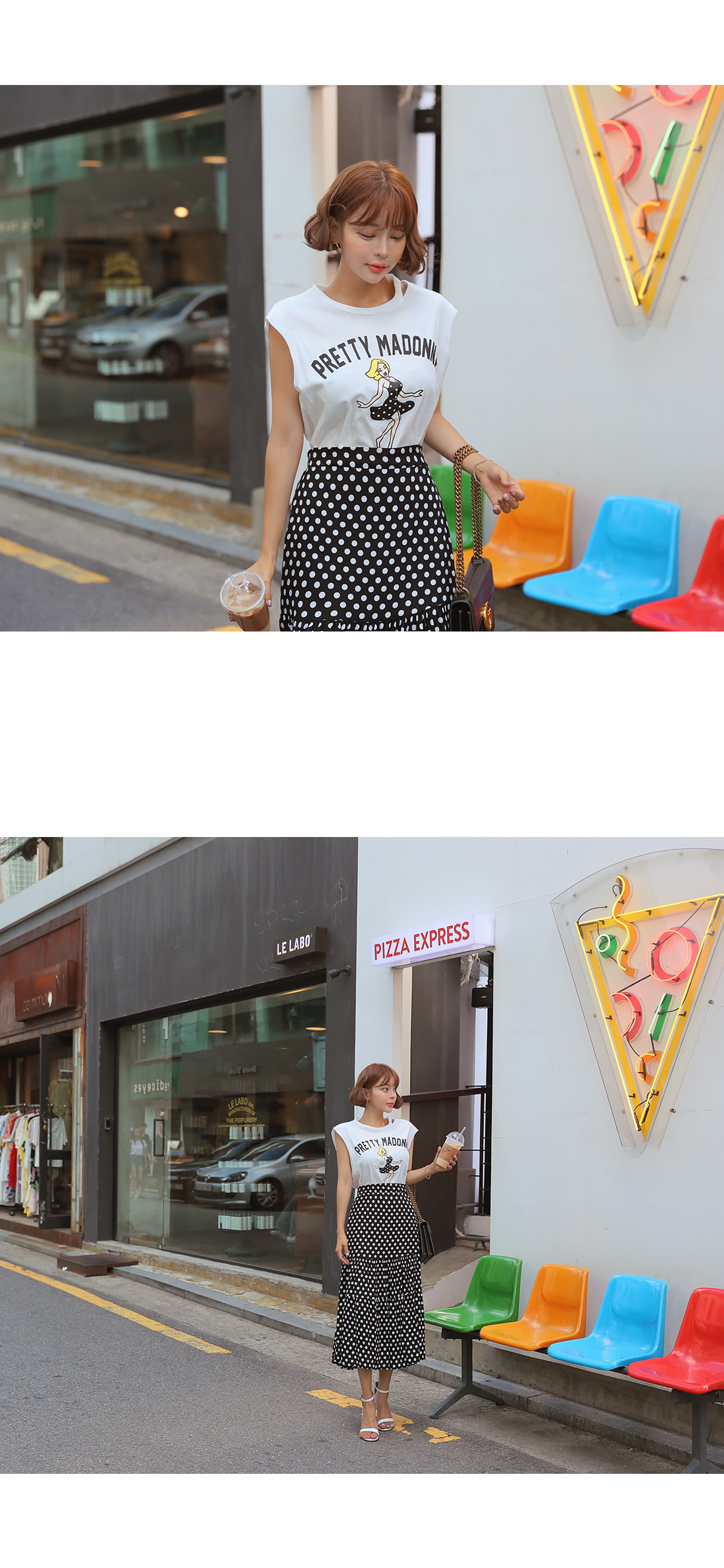 MD COMMENT포인트 룩을 완성시켜 줄 나염 티셔츠도트 롱스커트 SET아이템을 소개할게요.슬리브리스는 프론트에 유니크한 프린팅 디테일로멋스러운 포인트를 주었으며캐주얼한 무드도 가져갈 수 있는데요.여유있는 핏으로 부담없이 즐기기 좋으며 넥 라인에 트임을 주어 스타일리쉬한 포인트를 더해주었어요.암홀라인에 내추럴한 컷팅으로 마무리하여 룩에 빈티지한 무드도 느껴볼 수 있구요.스커트는 허리 높게 올라오는 하이웨스트 디자인에롱한 기장감이 더해져 다리라인을 길어보이게 연출해주구요.허리라인에 쫀쫀한 밴딩을 주어 안정감있는 착용이 가능해요.허벅지 중간 부분까지 오는 안감을 구성하여 비침걱정을 덜어주었으며별다른 오픈 클로징 없이 손쉬운 탈, 착용이 가능하답니다.슬리브리스와 스커트 모두 가벼운 폴리 소재감으로 S/S시즌 시원하게 즐기기 좋으며모델이 착용한 것처럼 set로는 물론- 각각 단독으로 다양한 아이템과 매치하여 활용도 높은 세트 아이템으로 추천해요!COLOR/SIZE블랙FREEMODEL FITTING블랙/FREE