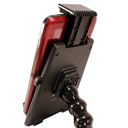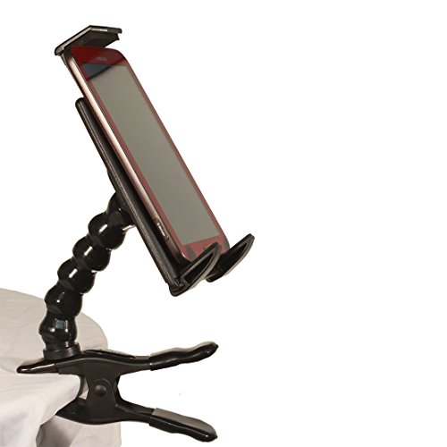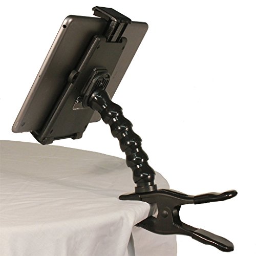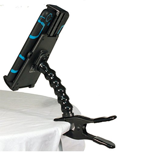 Universal tablet holder expands to fit all tablets having 9" to 12" screen sizes. 5.75" and 7.75" small sizel tablets can be used in the portrait position. Industrial-strength spring clamp. 360 degree, multi-directional mobility.