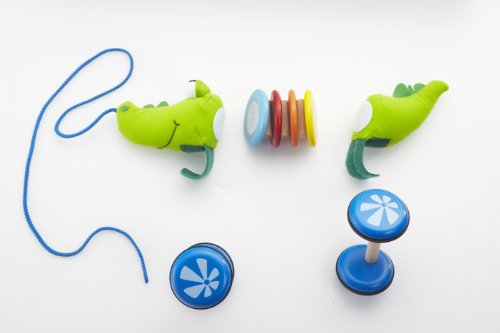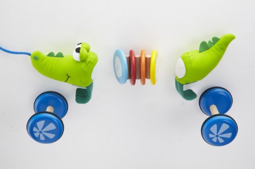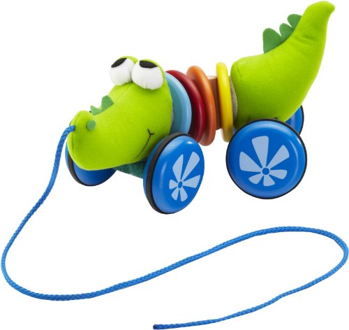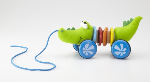 Fun and Flexible, the Wonderworld Pull Along Croco Kid is a great companion for your child to pull along while they play. The Wonderworld Pull Along Croco Kid is flexible and rattles when it is pulled along by its string. The Wonderworld Pull Along Croco Kid is constructed of soft colorful, plush fabric and 4 colorful painted wood ring in the center of its body. The wooden wheels are detachable so child can play with the soft plush crocodile and/or the rattling rings on its own. It is designed to be used by children who are one year of age or older. The Wonderworld Pull Along Croco Kid will be a constant tag along as your baby explores their curious world and discovers new modes of play.Feature