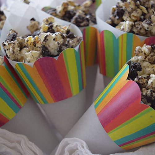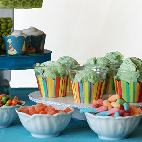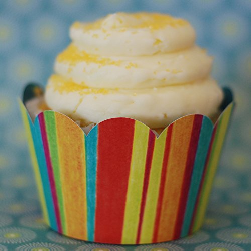 - Feature : QUALITY- Cupcake Wrappers Made in the U.S.A. with heavy-weight biodegradable paper, aqueous coating, and soy-based printing. / ADJUSTABLE- Wrappers come flat. Easy tab and slot closure adjusts to three sizes. / REVERSIBLE- Each bottomless wrap has two designs. Included- Stripe, Birthday Hats, Orange, Lime / EXCLUSIVE- Hand-designed Confetti Couture party supplies help make your party unique. / THEMES- Vintage birthday, rainbow, pool party, summer, spring, colorful