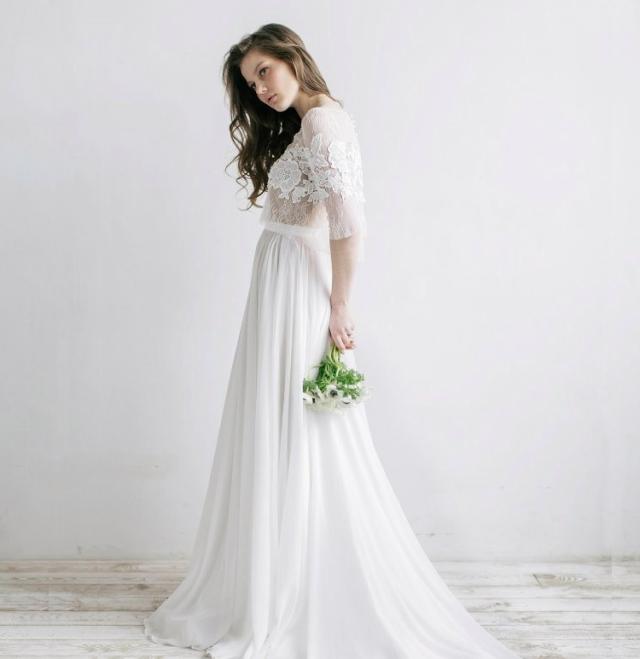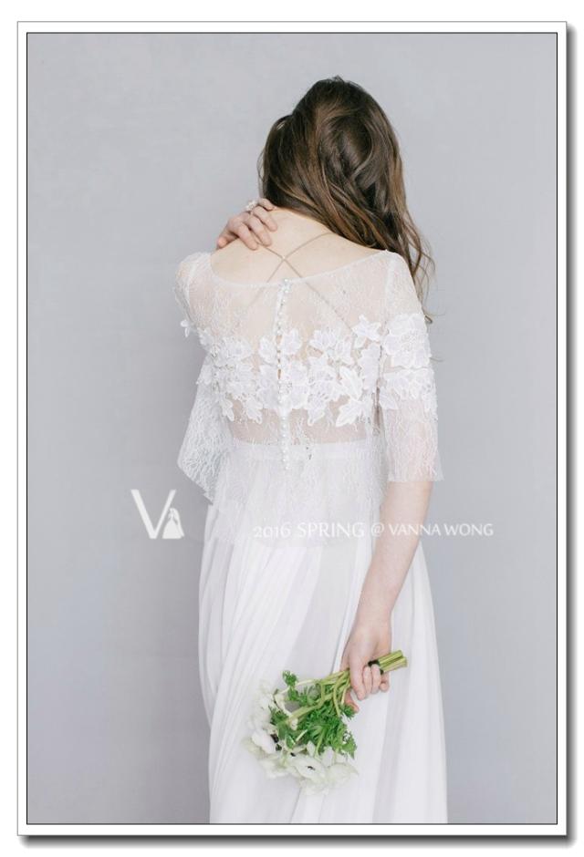 大ぶりのフラワーレースがかわいいウエディングドレスです。