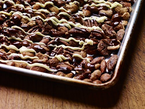 - PERFECT COMBO OF NUTS AND CHOCOLATE - mix of almonds, cashews, and pecans hand drizzled with dark, milk, and white chocolate over blend of savory spices. Mm..yummy!