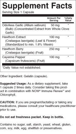 Suggested Use As a dietary supplement take 1 capsule 2 times daily. Store in a cool, dry place. - Or as directed by your healthcare professional. Supplement FactsServing Size: 1 CapsuleAmount Per Serving% Daily Value***Odorless Garlic (Allium sativum) (Bulb) (Concentrated Extract from Whole Clove Garlic)50 mg*Hawthorn Extract (Crataegus laevigata) (Leaf Flower) (Standardized to min. 1.8% Vitexin)100 mg*Hawthorn Berry (Crataegus laevigata) (Fruit)250 mg*Cayenne Pepper (Capsicum frutescens) (Fruit)100 mg* *Daily Value Not Established ***Percent Daily Values are based on a 2,000 calorie diet