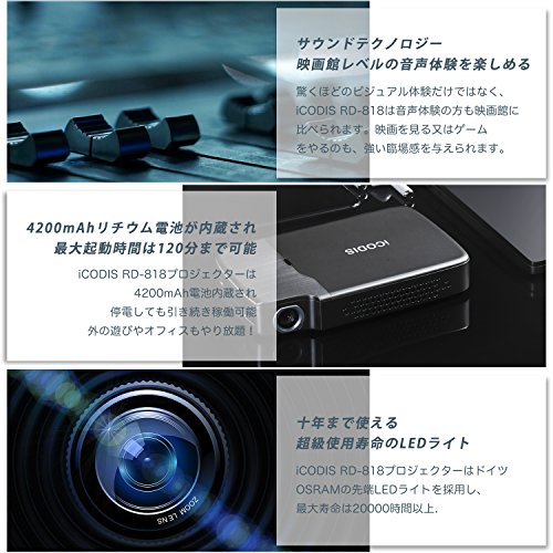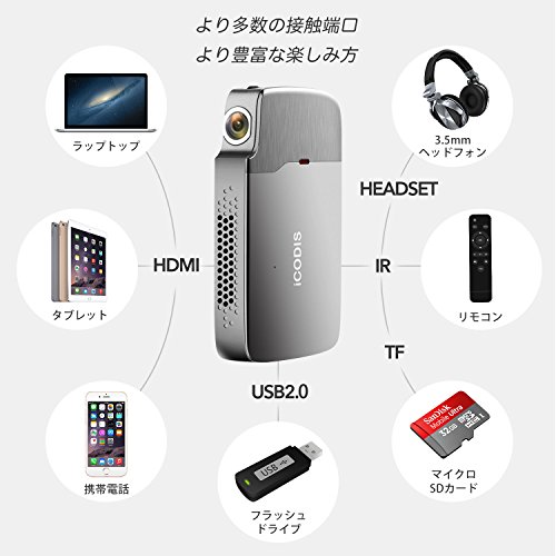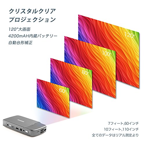 入力ポート:HDMI、USB、TFカードリーダー、イヤホン差込口。4,200 mAhの充電式バッテリー付き。 | スクリーンサイズ:20インチから120インチ。自動台形補正、投影画面を自動修正可能、より便利 | Max-DMD RGB LEDクアッドコア1.5GHz 4Kテレビチップ、 Max-DMD RGB-LED 0.2 クアッドコアグラフプロセッサーチップ |