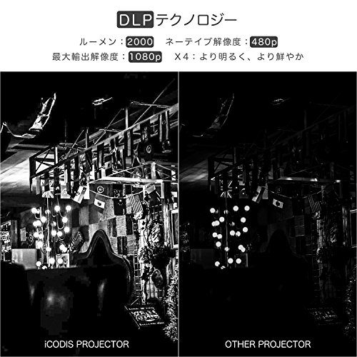 超2000ルーメン、ネイティブ解像度:480p、最大入力解像度:1080p、通常のLCDプロジェクターより4倍明るく鮮やか。