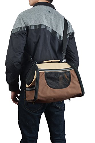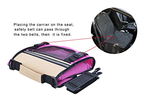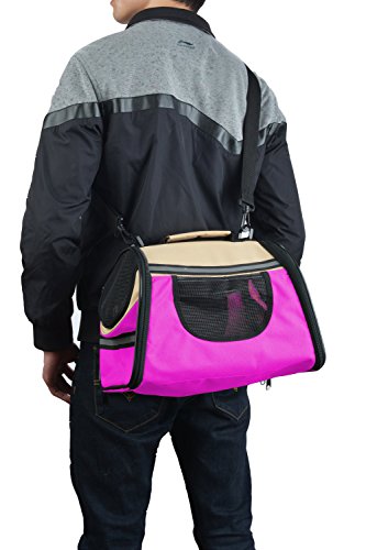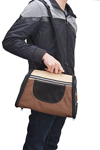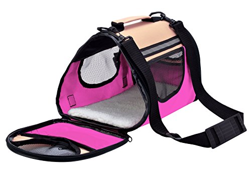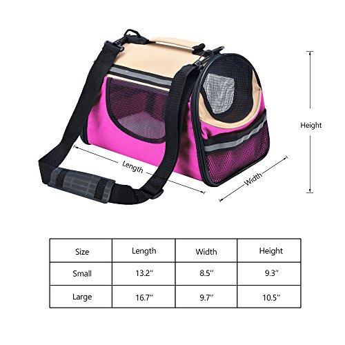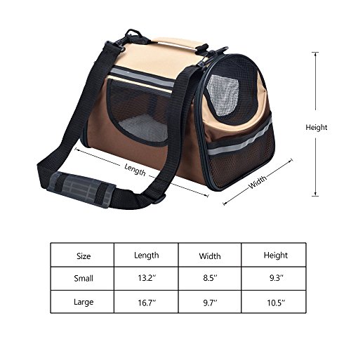 -. Feature : This carrier has two size:small and large,three colors:Wine red & Beige,Pink & Beige ,Coffee & Beige . / Made from high quality Oxford cloth,able to collapsible to save room when it is empty.easy washing &cleaning. / Included shoulder strap is adjustable,comfortable removable fleece travel bed,refective band added for extra security in the dark. / Mesh storage pocket at the sides is perfect for holding a leash or other accessories,like pet treats or toy. / Exclusive "Pet Connect" side zipper opening allows you to safely interact and comfort your pet while traveling