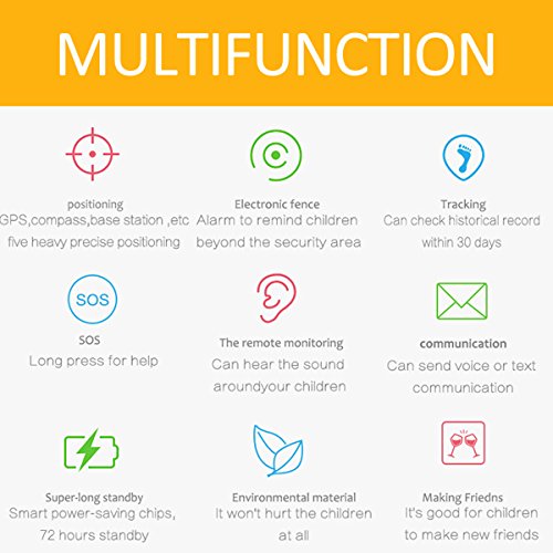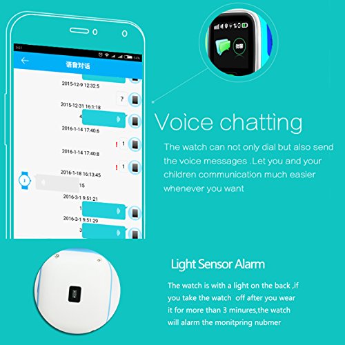 -. Feature : Candy Color Kids Smart Watch , Bluetooth supports IOS and Android systems , Parents can via app to control and set , a nice gift for 3-12 year old children , very charming for all occasions / Real-time Positioning , supports GPS , BDS , LSB Base station positioning etc. make the position more accurate , Parent could track the historical record , kids also could press SOS to ask for help / Voice Chatting , this watch supports Micro SIM Card Slort , kids could answer/return phone calls or send voice messages whenever / Fashion Cute Design Watch for Boys and Girls , use environmentally friendly material , 1.22inch Touch Screen , Colorful dial brings more fun to kids / Daily Water resistant to 99 feet (30 M): withstands rain and splashes of water, but not showering or submersion , Please DO NOT Press Any buttons in the water , Avoid using it in extreme hot or cold temperature