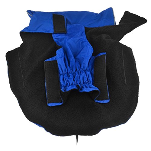-. Feature : Waterproof Nylon fabric with fleece lining / Velcro closure / Jacket style harness with D-ring on back / Hand wash recommended / Please measure your dogs body,neck, chest size before buying(The left size picture)