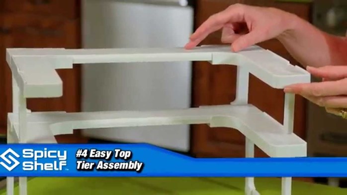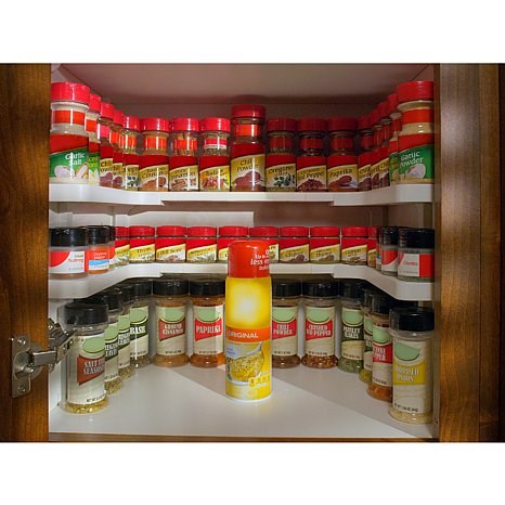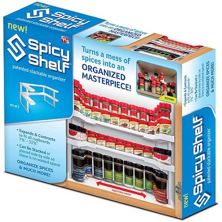 The Spicy Shelf, As Seen on TV, will help you get your spices organized! No more cluttered mess in your spice cabinet. Spicy Shelf fits any size cabinet and can be adjusted from 7.5" W to 17" W. The depth measures 10 3/8". Comes with 2 shelves that can be used side by side or stacked. Includes 2 different size legs for short or tall spices. Organizes up to 64 spice bottles!