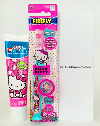 -. Feature : Bundle items: 1 Kid's Crest Hello Kitty Bubble Gum Flavored Toothpaste 4.2 oz, 1 FireFly Hello Kitty Oral Care Travel Kit Suction Cup Toothbrush with Cap, 1 Kids Dental Hygiene Tip Sheet (Complimentary) / Kid's Crest AntiCavity Toothpaste has a Bubblegum flavor that kids love. / FireFly Hello Kitty Toothbrush is recommended for Kids over 3 years old. / Kids Dental Hygiene Tip Sheet (Complimentary) -Lists valuable tips to encourage your kids to brush their teeth.