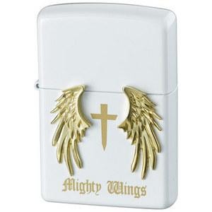 中央のクロスデザインの両脇に付けられた、まるで天使の羽を思わせる金色の左右のウイングメタルが特長的なメタルジッポー。ホワイトパール塗装仕上げ。