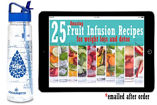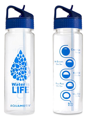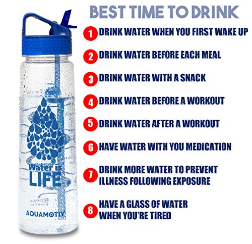 Stay hydrated this summer with this eye-catching inspirational water bottle with motivational time tracker. Our sipping schedule is convenient and easy to follow. Aquamotiv water bottles are made with a non-toxic BPA-free Tritan material durable enough to withstand whatever fitness activity you're involved in. Our flip-n-flow straw cap comes with a thumb tab - flip down to open and up to close. The lid comes with an angled hard plastic loop for easy carry or clips to your backpack. Take your bottle wherever your adventures take you. The perfect solution for sports athletes, players, joggers, hikers, and yogis too. Great for KIDS too! The large mouth opening leaves ample room to add ice or even create fruit infusion. The food-grade silicone ring (easily removable for cleaning) prevents leaks and if also BPA-free. Handwashing is recommended. 100% Customer Satisfaction - Lifetime Warranty. ** One refill will have you at the recommended daily water intake. ** Please note: Not associated with Motivational Bottle BrandFeature