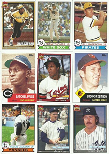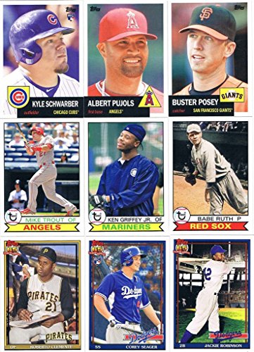Players pictured in the 1979 design include Babe Ruth, Randy Johnson, Eric Hosmer, Jose Canseco, Craig Biggio, Bill Mazeroski, Madison Bumgarner, Juan Gonzalez, Carlton Fisk, David Ortiz, Ken Griffey Jr., Mike Trout, Tom Seaver, Jim Palmer, Stan Musial, Kris Bryant, Frank Thomas, Honus Wagner, Yasiel Puig, Ozzie Smith, Lou Gehrig, Reggie Jackson and Bryce Harper plus rookie cards of Raul Mondesi Jr, Brandon Drury and Tom Murphy among others.