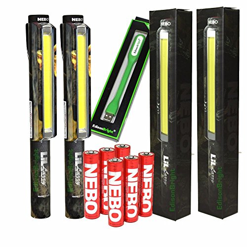 2 PACK Nebo LiL Larry 250 lumen 6466 Flashlight Super Bright COB LED Magnetic Worklight, Camo print with 6 Nebo AAA batteries and EdisonBright USB powered reading light bundle