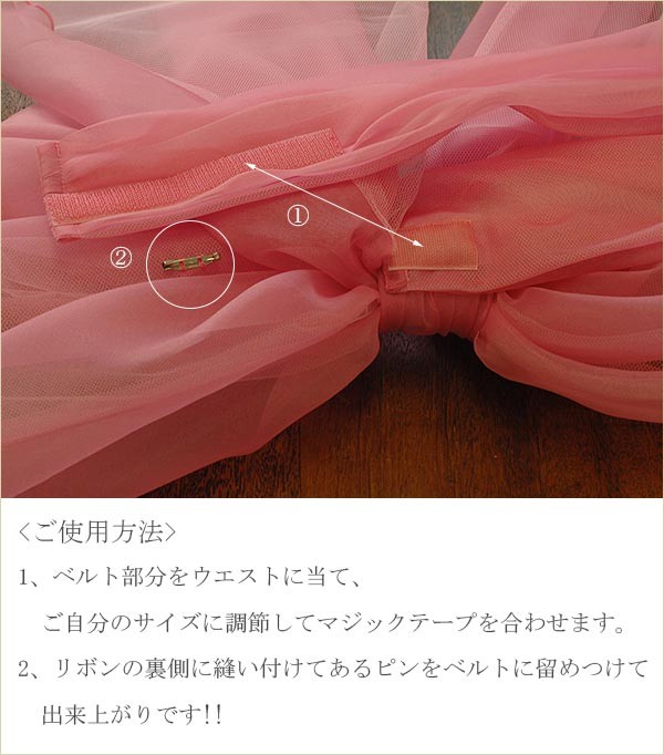 ■ご使用方法■ 1、ベルト部分をウエストに当て、ご自分のサイズに調節してマジックテープを合わせます。 2、リボンの裏側に縫い付けてあるピンをベルトに留めつけて出来上がりです!!