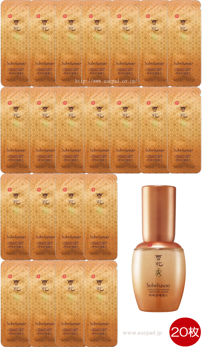 雪花秀(ソルファス) の高麗人参カプセル!ジャヨジンエッセンス 20枚(計 20ml) です。 【商品説明】 若い肌慣性の力で深まっていくシワを押し出し、弾力は持ち上げる人参カプセルエッセンス -Ginsenisphereがお肌の弾性を強化し、ぷりっと弾力のあるお肌に変えてくれます。 -しっとりと吸収されながらお肌の保護幕を形成し、なめらかな肌キメを与えます。 ☆主要成分☆ Macro Ginsenisphere・・・紅参多糖体がが豊富な紅参根原物をお肌に最適に吸収される素材と合わさってカプセル化されたことで、お肌をみっちり綿密にし弾性を強化させます。 Micro Ginsenisphere・・・人参サポニン(Cpompound K)と人参抽出物を最新アミノ酸リポゾーム技術でカプセル化し、弾性が崩れないようにお肌をしっかりと支え守ります。 【使い方】 朝晩、滋陰水 (トナー)使用後、適量を手のひらにプッシュし肌キメに沿って指先ではたくように塗布します。 手のひらでやさしく顔を包み込むように覆い、お肌に浸透させてください。 【内容量】 20ml(20枚)