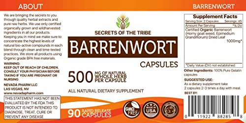 -. Title : Barrenwort 90/230 Capsules, 500 mg, Organic Barrenwort (Horny goat weed, Epimedium Grandiflorum) Dried Leaf