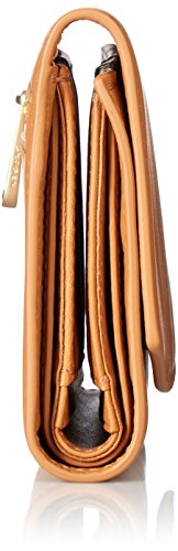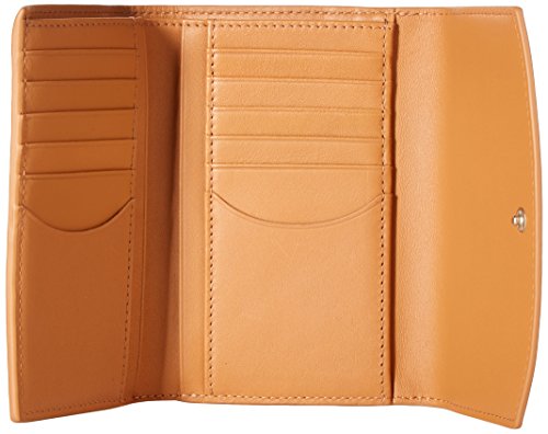 The snap-secured flap of the compact flap wallet opens to reveal 12 credit card slots, four slip pockets and two bill slots. On the exterior, a zip pocket secures change.