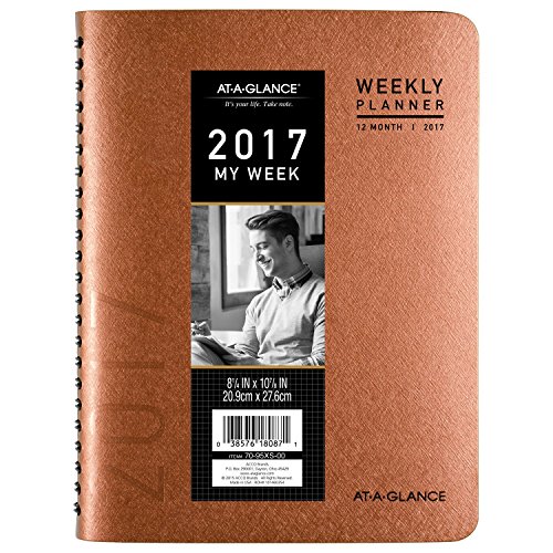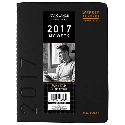 -. Binding : Office Product -. Brand : At-A-Glance -. EAN : 0038576180871 -. Feature : Contemporary weekly / monthly appointment book has a unique cover and modern design. Planner runs 12 months, January - December. / Two page weekly spreads list half-hourly appointment times from 8:00 a.m. and 5:30 p.m. Monday - Friday. Weekends are untimed. / Two page monthly spreads are tabbed for quick page turning. Daily blocks are unruled. Please note color choice is not available to customer, the color will be selected at random for you. -. Label : ACCO Brands -. Manufacturer : ACCO Brands -. Model : 7095XS00 -. MPN : 7095XS00 -. NumberOfItems : 1 -. PackageQuantity : 1 -. PartNumber : 7095XS00 -. ProductGroup : Office Product -. ProductTypeName : OFFICE_PRODUCTS -. Publisher : ACCO Brands -. Studio : ACCO Brands -. Title : AT-A-GLANCE Weekly / Monthly Appointment Book / Planner 2017, 8-1/4 x 10-7/8", Color Selected For You May Vary (70-95XS-00) -. UPC : 038576180871