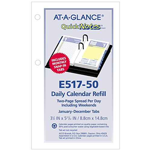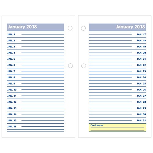 -. Feature : Calendar refill features Quick Notes writing area where you can conveniently jot down to-do's, meeting notes, contact info and more. 12 month date range covers a full calendar year from January-December helping you keep organized all year long. Julian dates / Two pages per day spreads with half hourly appointments, 7:00 a.m. - 5:00 p.m. on the left hand side and Quick Notes writing area on the right hand side for detailed scheduling and note taking. Features past, future and current months reference / 3.5 in. x 6 in. page size. 3.88 in. x 6 in. x 1.31 in. overall size / Monthly tabs with one tab per month allow for easy referencing of dates. Two-color P.R.Inting with yellow and blue provides a visually appealing backdrop for your office / P.R.Inted on quality paper containing 30% post-consumer waste