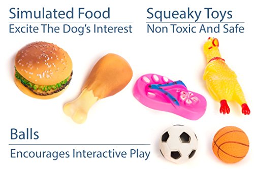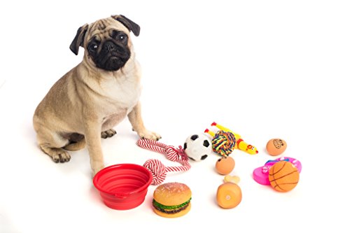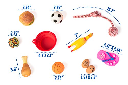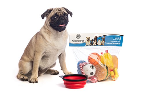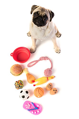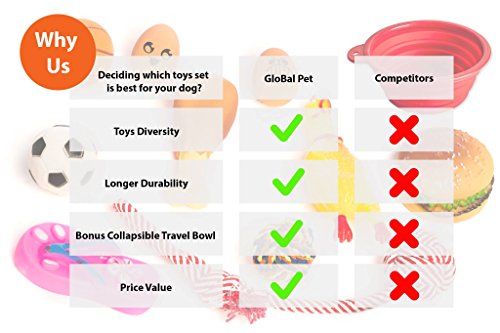 -. Feature : ENDLESS HOURS OF FUN: The dog toy set has 10 different kinds of toys for your dog to play with. The set includes chewing toys in fun and colorful designs, balls for fetching and a knot rope for endless hours of fun. With this unique squeaky toy set you can play with your buddy and help him exercise and stay healthy. / CHEW THE TOYS NOT THE FURNITURE: Dogs have a natural urge to chew on things so that they can keep their teeth strong and healthy. Your dog will never chew on your furniture or shoes again with this amazing chew toy set! Your dog will have fun and satisfy its chewing urge while keeping its teeth and gums clean and strong. / EXTREMELY DURABLE: Forget about the chew toys that get shredded within minutes! The Global Pet rubber toys are extremely durable and strong so that your pet can chew as much as it needs to without turning the toys into pieces. The sturdy toys will be more challenging for your dog and more fun! / PERFECTLY SAFE FOR YOUR PUPPY: All of the toys in this set are made with high quality materials that are completely non-toxic and they are safe for your dog and the environment. The strong toys will not be cut into pieces after chewing to prevent any choking hazard. / BONUS COLLAPSIBLE BOWL: Our pet toy set is perfect for long walks with your dog and play time in the park. We know that your buddy might get thirsty so we offer you with each toy set a silicone collapsible bowl! The bowl is very lightweight and compact so you can have it with you everywhere you go!