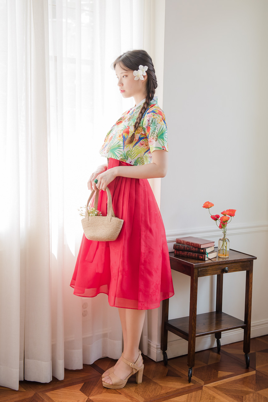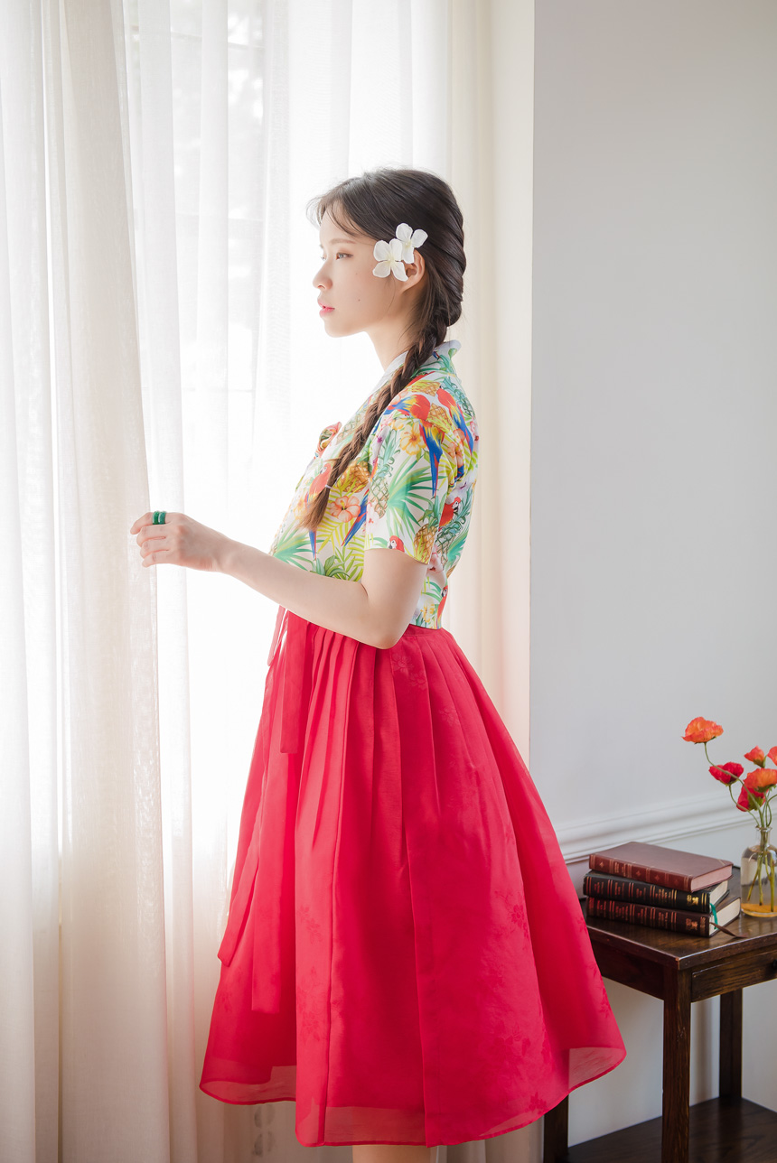 꽃닮 나래 빨강색 허리치마와 함께 센스있는 생활한복룩을 완성해보셔요.