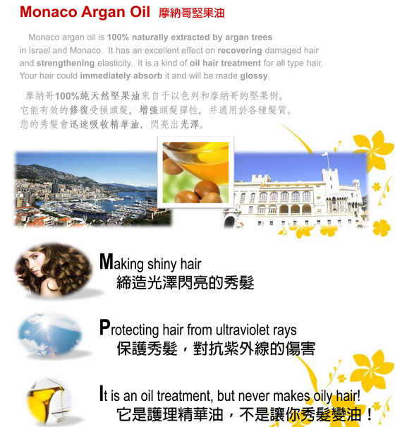 Monaco Argan Hair Care Oil is 100% naturally extracted from the argan tree in Morocco. It has an excellent effect on recovering damaged hair and strengthening elasticity. It is a kind of oil hair treatment for all hair types. Your hair could immediately absorb it and will be made glossy.