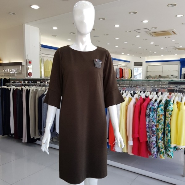 라운드네크의 소매 나팔훌 디테일의 H라인 원피스-JA7F9-WOP200-올리브