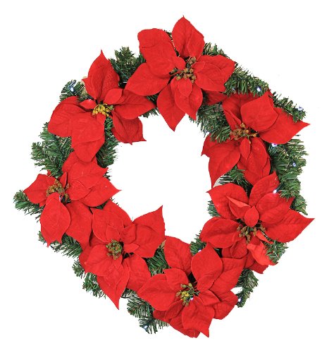 LB International Pre-Lit Battery Operated Red Artificial Poinsettia Christmas Wreath with Clear LED Lights, 22"