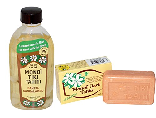 Monoi Tiki Tahiti Santal Sandalwood and Monoi Tiare Tahiti Coconut Oil Soap Bundle With Coconut Oil and Vitamin E, 4 fl. oz. and 4.55 oz