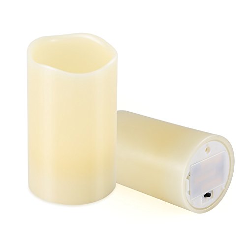 Material Type: Real Wax, ABS Color: Ivory White Dimension: 2" (diameter) x 2.5" (height) Remote Control with timer selection: 4/8 hours off timer (NO AUTO ON) Battery type: Each candle requires 1 x CR2450 Batteries (Included) which will last approx 100 hours. Remote control requires 1X CR2032 button battery (included)