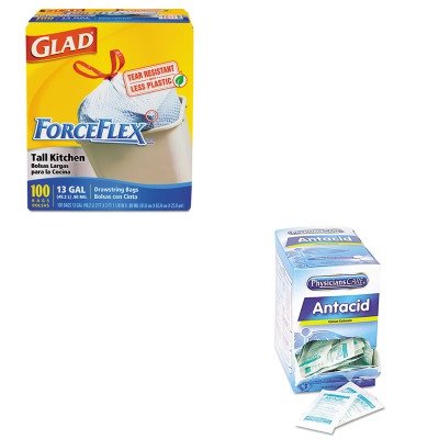 Studio : PhysiciansCARE Publisher : PhysiciansCARE Binding : Office Product Product Description strongCOX70427/strongBR/Glad ForceFlex Tall-Kitchen Drawstring BagsBR/One quick pull and its closed Only Glad has the strength of ForceFlex, the unique diamond-textured plastic that stretches, preventing rips and tears. Three-layer drawstring makes even the fullest bag no problem to close, lift and carry. Application: Can Liner Capacity Range Volume: 13 gal Materials: Plastic Colors: White.BR/BR/strongACM90089/strongBR/Physicianscare Antacid Calcium Carbonate MedicationBR/Calcium carbonate chewable tablets help reduce your stomachs acidity level, providing relief from heartburn and acid indigestion. Packaged for individual use to replenish first aid stations and kits. Description: 2/Pack Quantity: 50 per box. 0