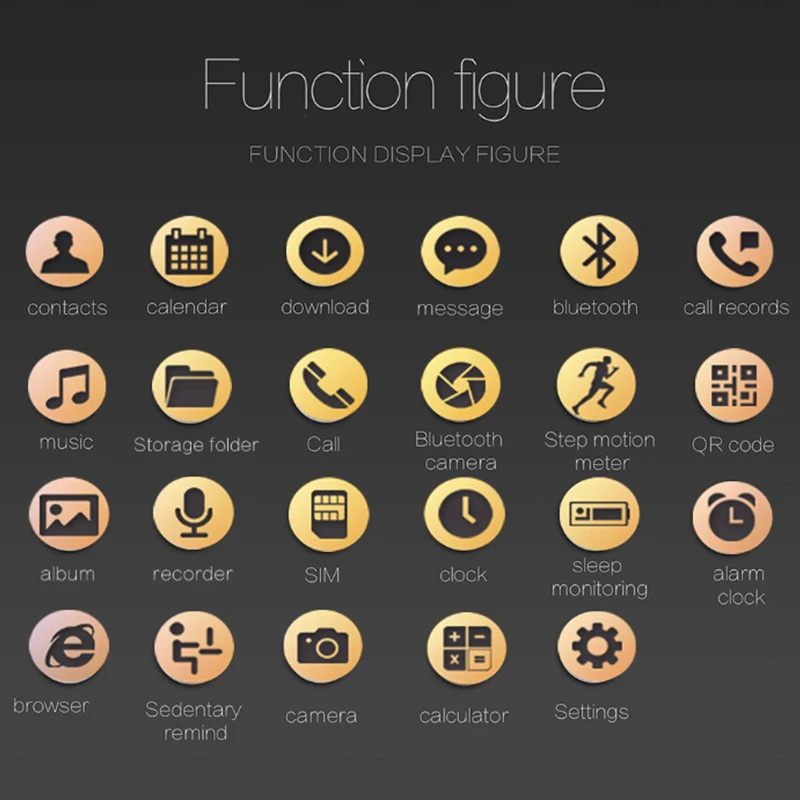 Function:Week,Dial Call,Message Reminder,Answer Call,Passometer,Alarm Clock,World Time,Permanent Calendar,Call Reminder,Month,Push Message