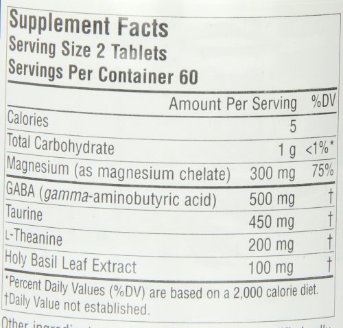 Dietary supplement. Calming complex with Gaba. Don't let occasional stress get you down. Theanine Serene contains the amino acids L-theanine, to support relaxing brain wave activity, and taurine to ease tension, as well as the calming neurotransmitter GABA. It also features magnesium to support muscle and nerve relaxation, and calming holy basil leaf extract to gently soothe away the tension in your body. Try Theanine Serene to start relaxing today. (These statements have not been evaluated by the Food and Drug Administration. This product is not intended to diagnose, treat, cure or prevent any disease.) Suitable for vegetarians. Contains no yeast, dairy, egg or soy. Contains no sugar, salt, preservatives or artificial color, flavor or fragrance.Feature