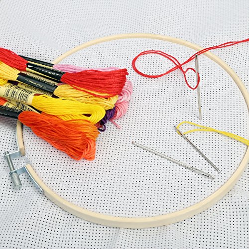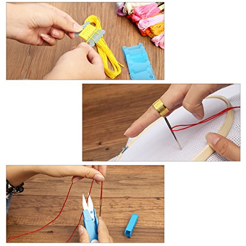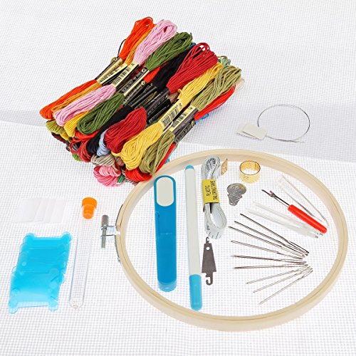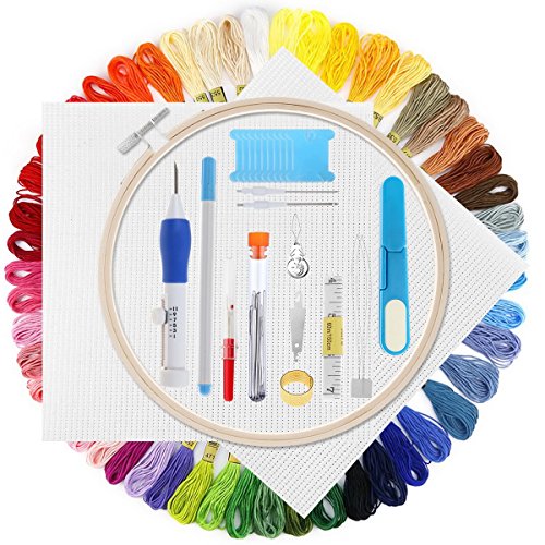 - ❃Set Content❃ The package contains everything you need, 1pc Magic Embroidery Pen (with 3 different size changeable needles), 2pcs threaders, 1pc bamboo embroidery hoop, 50 color threads, 2pcs 14 count white cotton classic reserve aidas, 10pcs floss bobbins, 9pcs 3 sizes embroidery needles,1pc cross stitch needle-threading tools, 1 pair of scissor, 1pc ink marking pen, 1pc measuring tape, 1pc thimble, 1pc untwist tool, 1pcs instruction。