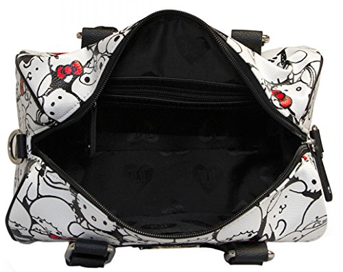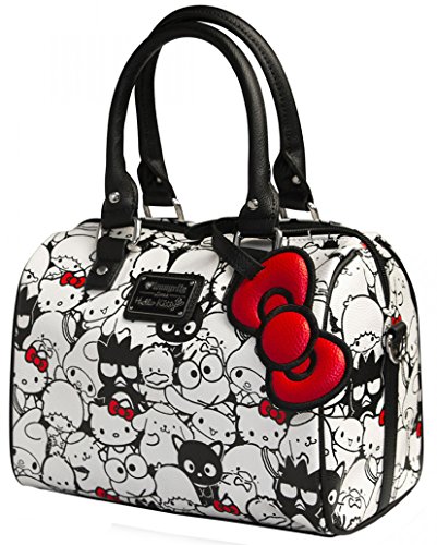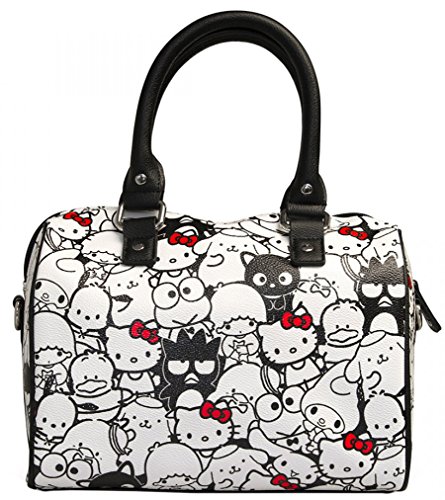 This stylish faux leather duffel has an all over print of your friend Sanrio characters and features rolled handles, a detachable bow charm and adjustable, detachable shoulder strap!