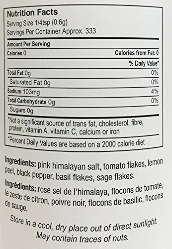 -. Feature : Makes Virtually all Types Of Poultry, Fish, Salads, and Meat Come Alive with Flavor. / Superb When Used to Saute or Roast Vegetables, and Season Soups, Gravies, Sauces, Meatloaf and Much More!! / Ingredients Pink Himalay Salt 84 Percent, Tomato, Lemon Peel, Basil, Black Pepper and Sage