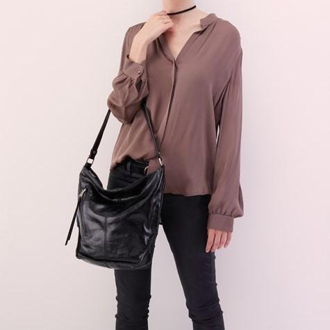 Zipper closure. Top carrying handle. Exterior front zip pocket. Exterior back slip pocket. Flat bottom. Lined interior. Interior back-wall zip and slip pockets.