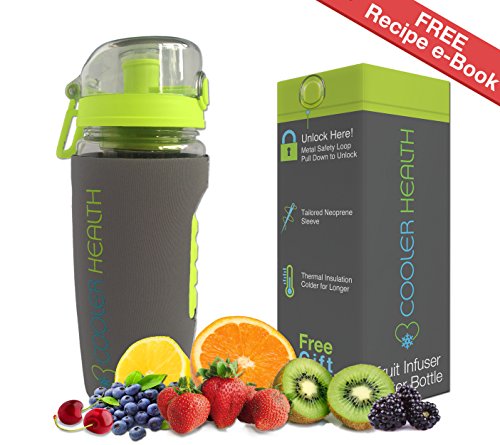 -. Brand : Cooler Health -. Color : Green -. EAN : 0646437213318 -. Feature : ✔ ANTI SWEAT SLEEVE: Keep your water cool and prevent "bottle sweat" with our tailored neoprene sleeve. Custom fit to our bottle with cut outs around the silicone grip and base to prevent the toppling you get with other bottles and their sleeves. / ✔ FREE RECIPE EBOOK & STARTER GUIDE: Get infusing immediately with the handy ebook included with your infuser bottle. Full of recipes and tips to help you in your infusing journey. Instructions included on how to get your copy. / ✔ MORE WATER. MORE FLAVOR: At 32 oz. we give you up to 25% MORE than other infuser bottles! But at a convenient size to travel with and fit in your car cup holder. / ✔ LEAK PROOF TECHNOLOGY: Rubber seals around the screw cap and spout to prevent leaks and give you peace of mind. With a tough BPA free plastic construction, your bottle can take any knocks you throw at it. / ✔ LIFETIME GUARANTEE: Premium quality products & customer service are at the core of our family run business. Each bottle is thoroughly inspected before going on sale. But if you're not completely happy with your infuser bottle simply get in touch and we'll look after you. Order with confidence today! -. IsAutographed : 0 -. IsMemorabilia : 0 -. Label : Cooler Health -. Manufacturer : Cooler Health -. MPN : 3355711 -. PackageQuantity : 1 -. PartNumber : 3355711 -. ProductGroup : Sports -. ProductTypeName : OUTDOOR_RECREATION_PRODUCT -. Publisher : Cooler Health -. Size : 32oz -. Studio : Cooler Health -. Title : Best Fruit Infuser Water Bottle - FREE Infusion Recipe eBook & Anti Sweat Sleeve - 32oz - Full Starter Kit - BPA Free Plastic - Insulated - Best for Fruit Infused Water Travel Sport -. UPC : 646437213318