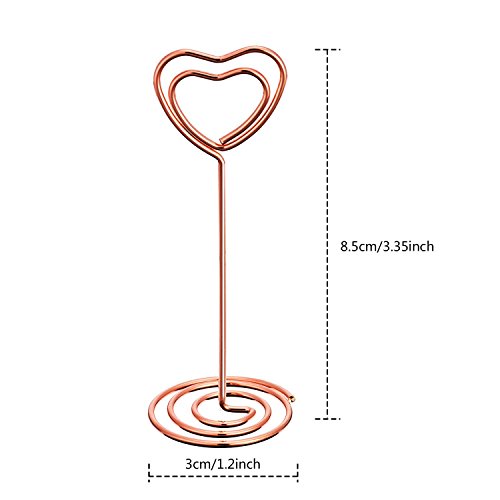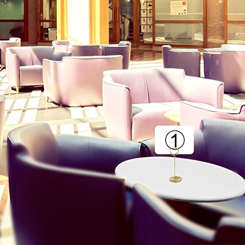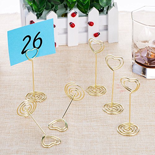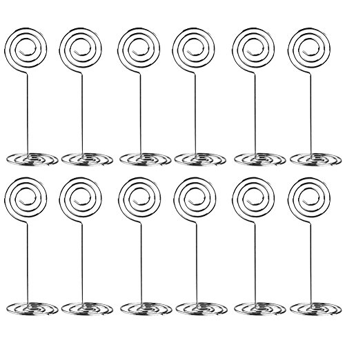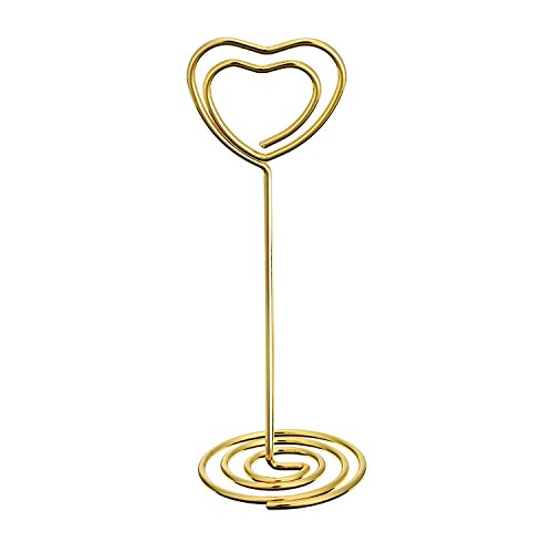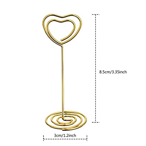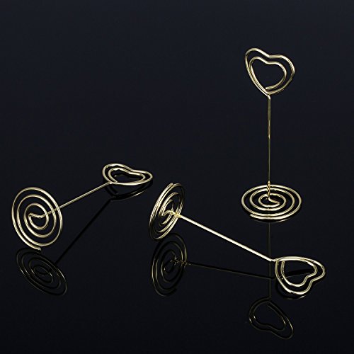 -. Feature : Quantity: set of 12 number card holders; Size (about): 8.5 cm/ 3.35 inch in height, 4 cm/ 1.58 inch in bottom base width / Sturdy wire number holders: made of nickel plated carbon steel, durable to use; The wire diameter is 1.5 mm/ 0.06 inch, not easy to break off / Wide spiral base: desktop card holder with base widened to 4 cm/ 1.58 inch to stand steady; If it's a windy day, it is better to place some small heavy items on it for standing in place / Wedding table number holders: good-looking photo holder stands with circle clip and spiral base, shiny gold color and beautiful shape is good as tabletop decorations / Usage: can serve as memo, photo, note, paper, name card clip; Suitable for wedding favors, offices, anniversaries party, home decorations, etc.