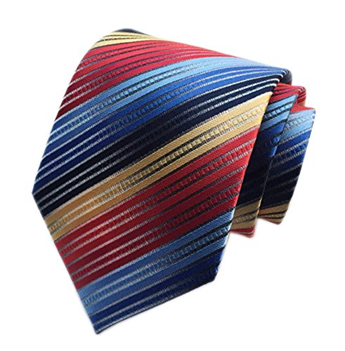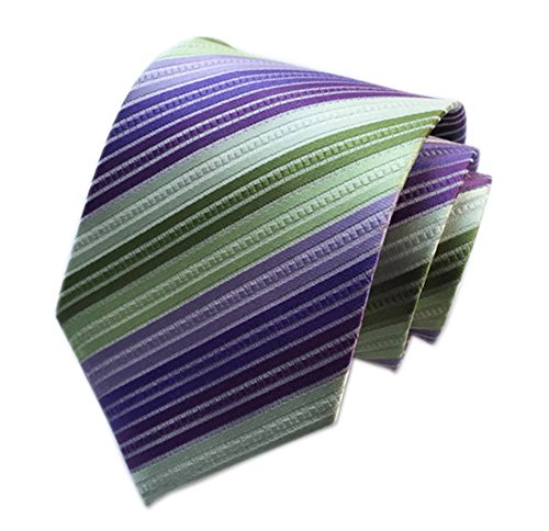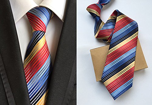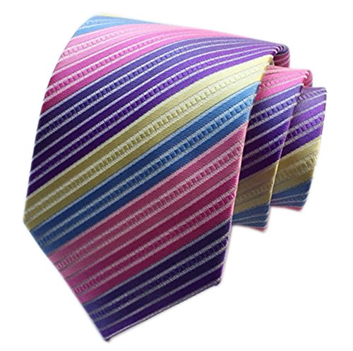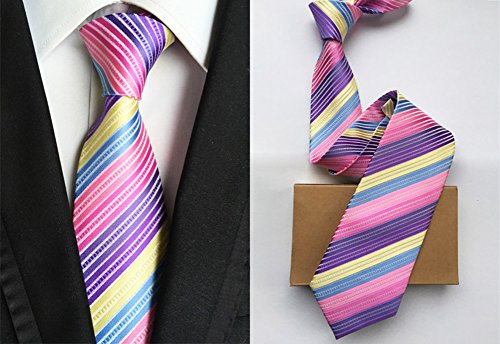 1) Push your boundaries and look as dapper as ever with our multi-colored tie, handmade by Secdtie. They creatively combined a winning combination of colors, such as purple, fuchsia, pink ,blue and yellow. Incorporating a striped design, you will feel trendy and fun. Who knew this would be the tie that captured our hearts?. 2) Pair this piece effortlessly with a chambray button up in gray. The two totally different designs will prove to be a perfect combination for a day at the office or a night out..