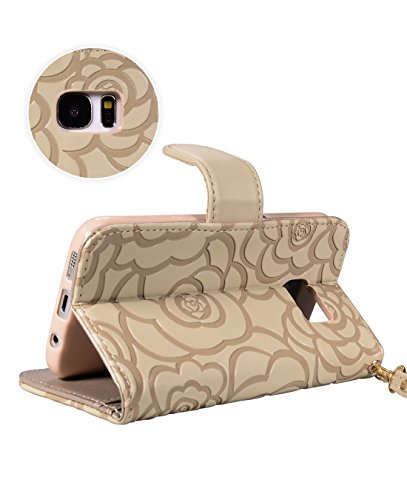 Samsung Galaxy S7 wallet case, FLYEE® Premium Vintage Emboss Flower Flip Wallet Shell PU Leather Magnetic Cover Skin with Detachable Wrist Strap Case for Galaxy S7 5.1 Inch -Beige